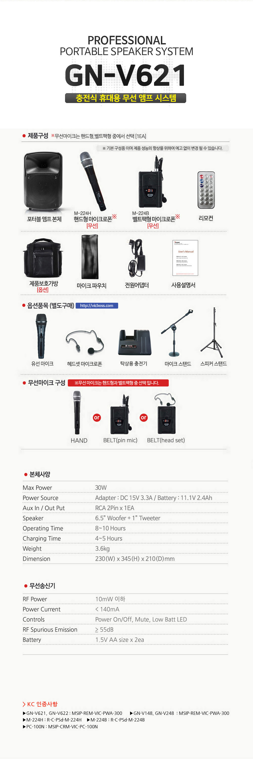 무선마이크 PLL(채널가변형) 방식으로 혼선시 채널 가변 가능.