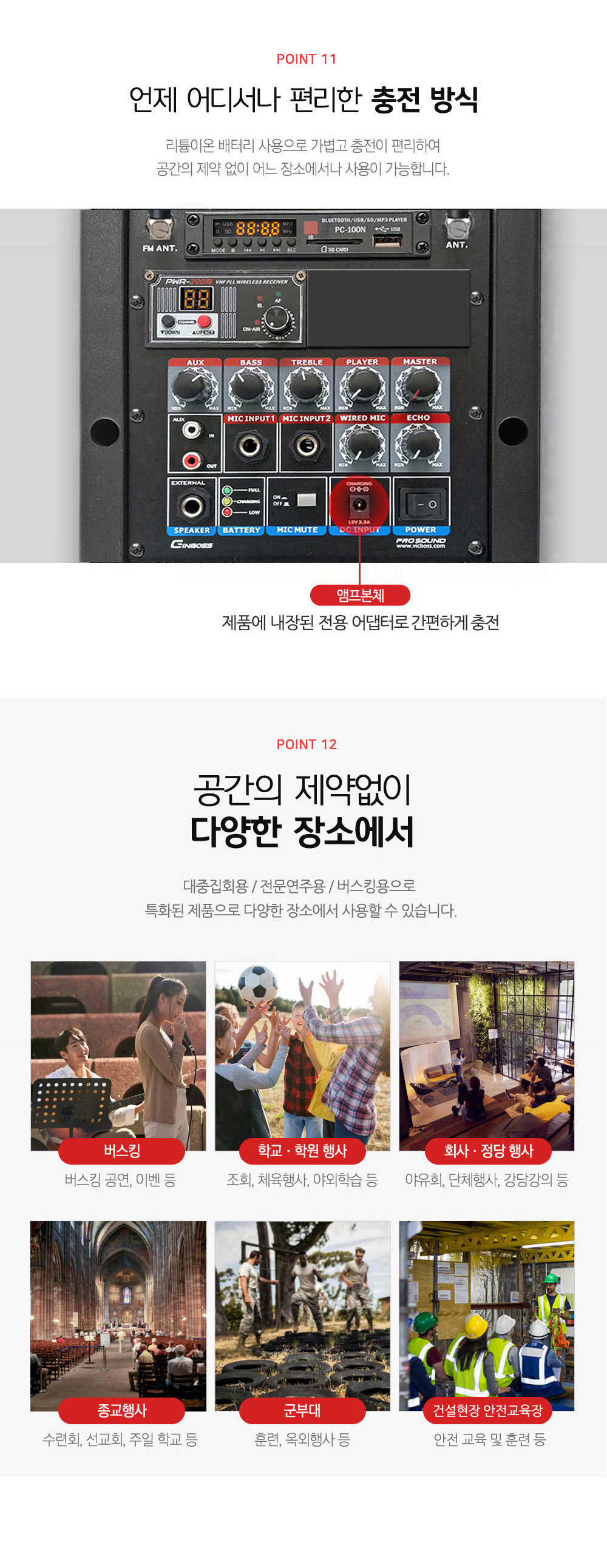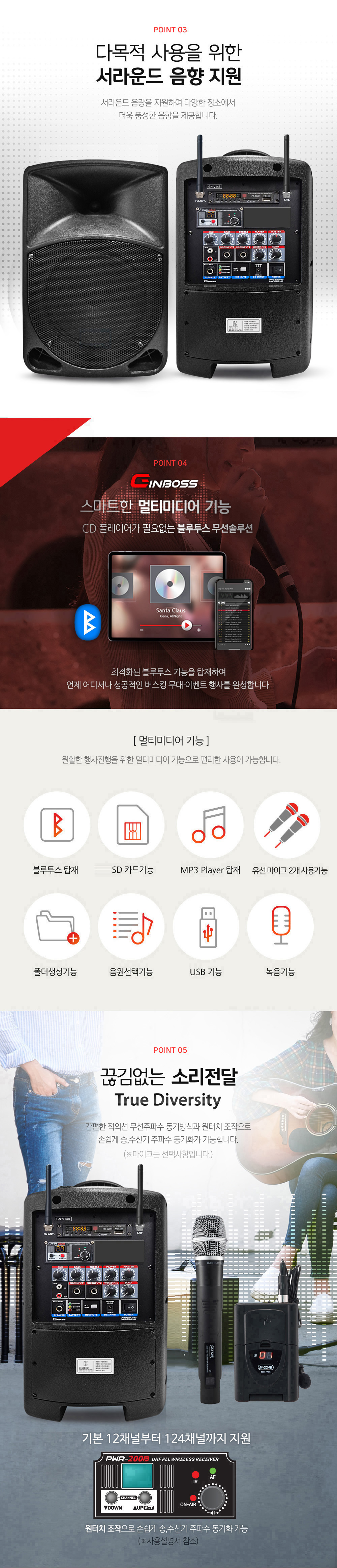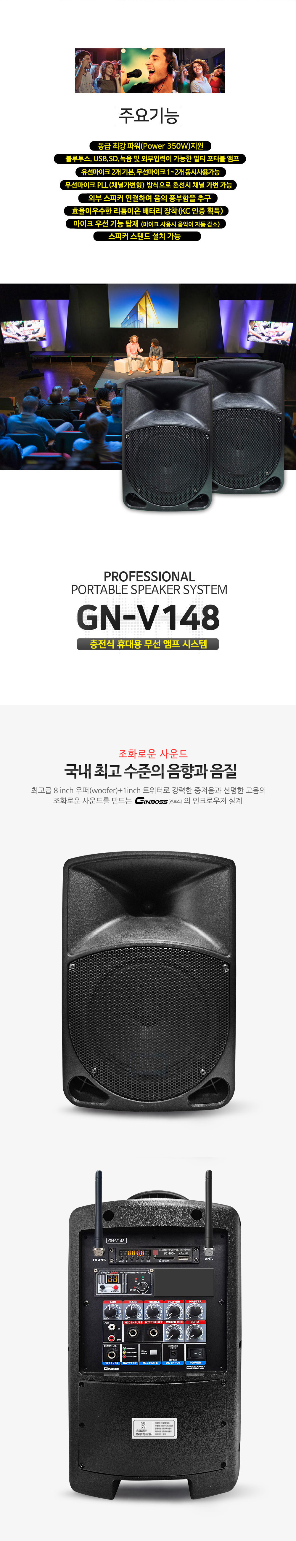 블루투스, USB, SD, 녹음 및 외부입력이 가능한 멀티 포터블 앰프.