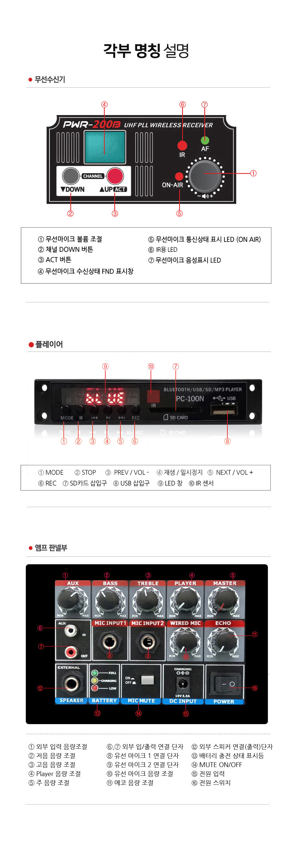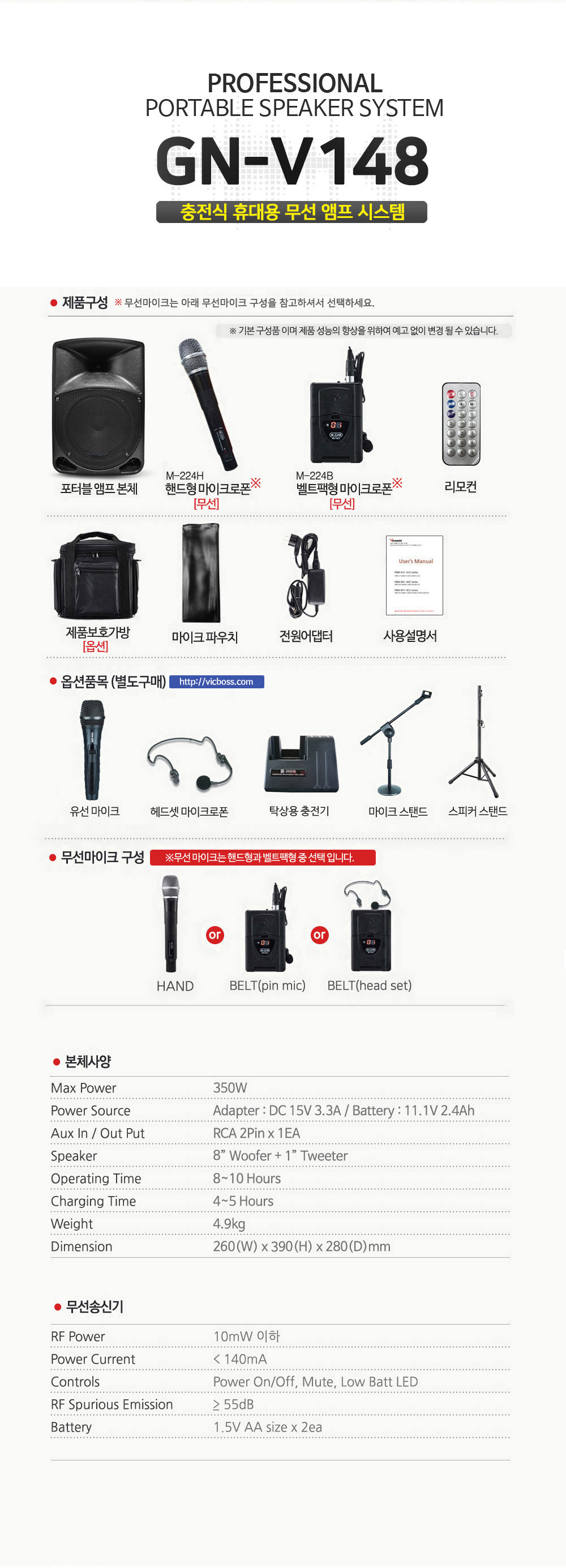 무선마이크 PLL(채널가변형) 방식으로 혼선시 채널 가변 가능.