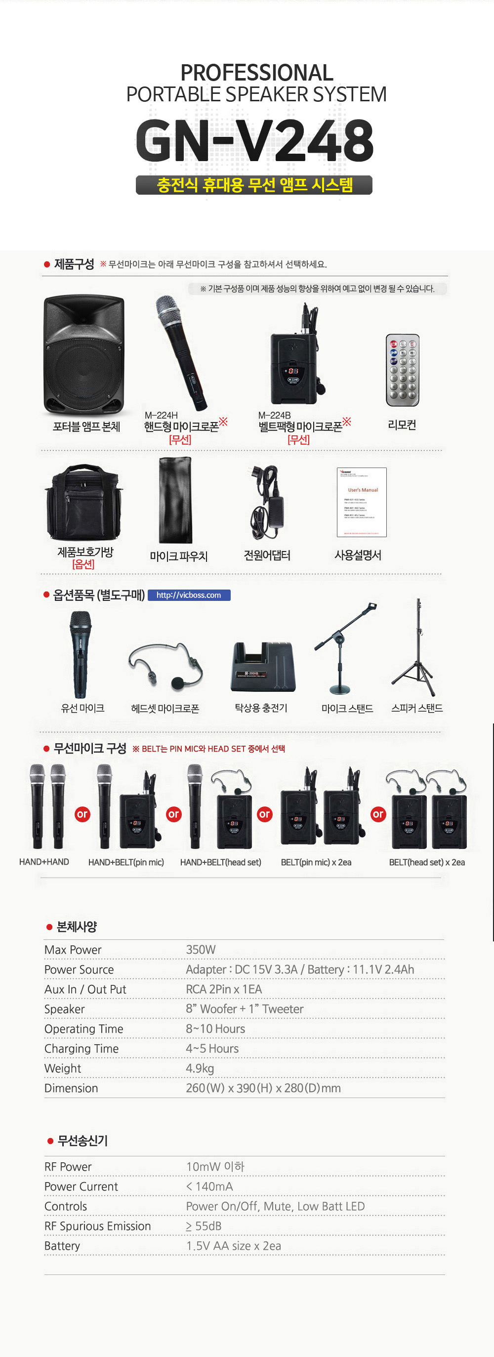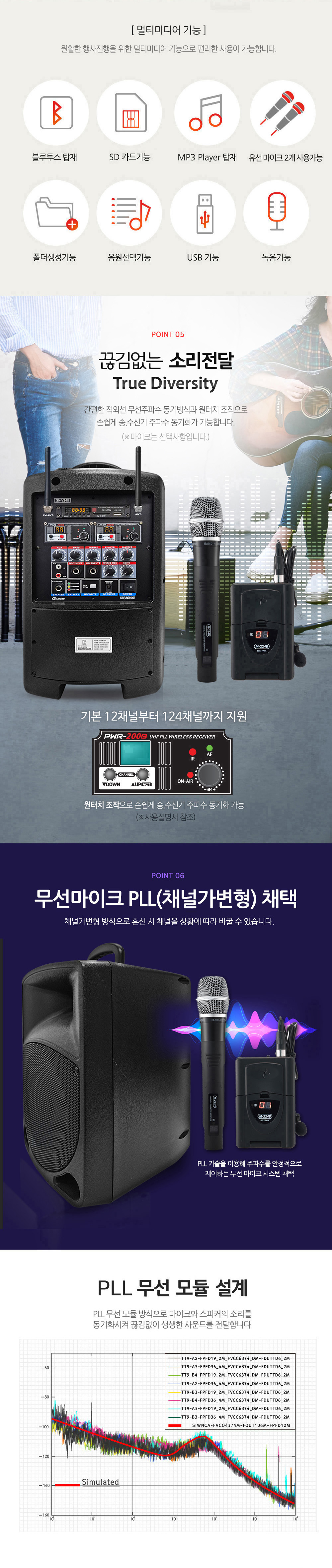 무선마이크 PLL(채널가변형) 방식으로 혼선시 채널 가변 가능.